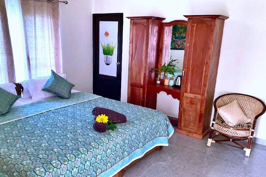 Deluxe AC room has beds with linens and pillows, towels, wardrobe with mirror, ceiling fan, AC, attached